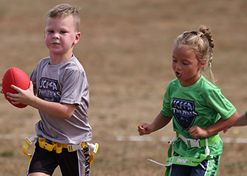 * One coach on offense and one coach on defense will have a whistle. Only blow the whistle when the kid scores a TD or if the ball is fumbled. If the player falls down or Even if the player's flag is pulled, let them get up and make it to the endzone! Each team can have (at the most) two coaches on the field. On offense, the 2nd coach should stand in the endzone as a point of destination for the kids to run to. |